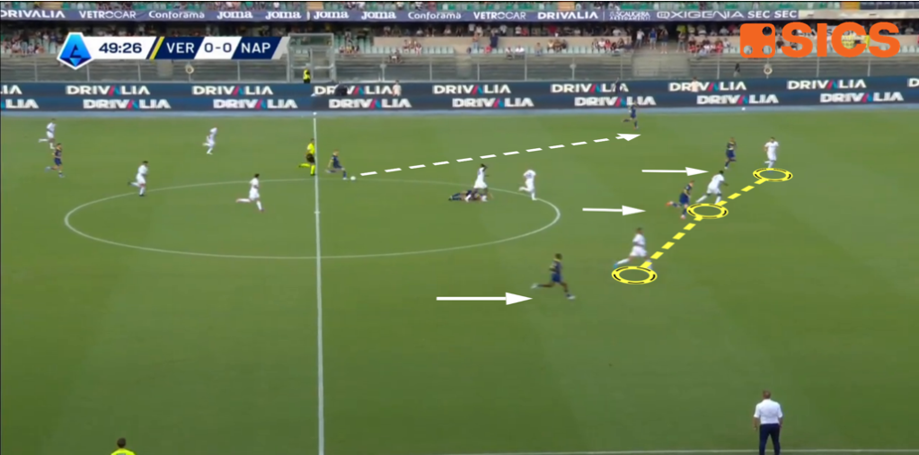 Il contropiede dal quale scaturisce il gol veronese di Livramento. Il Napoli perde le coperture preventive e si trova sbilanciato.