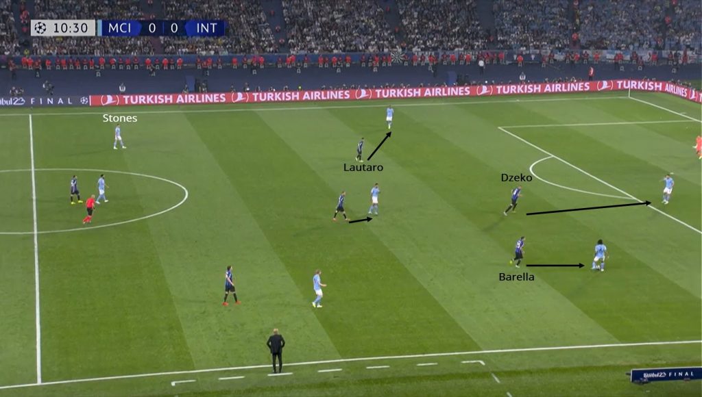 Guardiola ha sorpreso tutti con la posizione di Stones, schierando la squadra quindi con un 3+1 in fase di costruzione, contro il consueto 3+2 attuato in stagione dal City. Una scelta che nasce anche dalla capacità dell’Inter di saper ripartire bene sfruttando la sua capacità di recupero palla, specialmente con le mezzali e i braccetti di difesa. L’Inter ha lavorato molto bene sulle scalate, meno invece in fase offensiva dove se avesse avuto maggior precisione poteva anche pensare di vincere la partita, dato che il City ha concesso un paio di situazioni clamorose dovute anche all’enorme pressione psicologica che avvertivano i calciatori. Guardiola pensava con questa scelta rivelatisi conservativa di mandare in difficoltà le scalate dell’Inter, ma i nerazzurri hanno saputo saggiamente adeguarsi con grande acume tattico.
