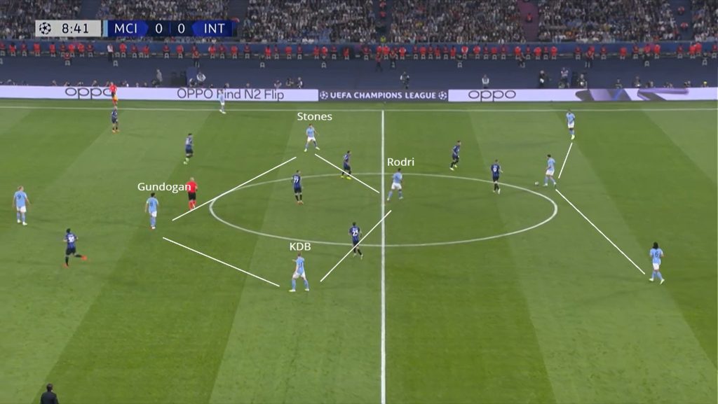 1) Il 3313 del City in fase di possesso con Stones a fare la mezzala destra (di solito giocano col 3241, con Stones che rimane più bloccato al fianco di Rodri).  Contro l’Inter, invece, Guardiola ha schierato Stones formalmente da terzino destro, con Akanji al centro della difesa. In fase di possesso Stones non ha affiancato Rodri costituendo una struttura con un doble pivote, ma si è alzato in posizione di mezzala destra, con la squadra che ha disegnato in fase d’attacco una sorta di 3-4-3 con il centrocampo a rombo e i due esterni offensivi molto aperti. Nel rombo di centrocampo, almeno fino alla metà del primo tempo, è stato, piuttosto sorprendentemente, De Bruyne ad occupare la posizione di mezzala sinistra, con Gundogan a fungere da vertice avanzato.