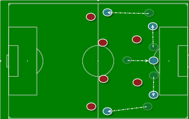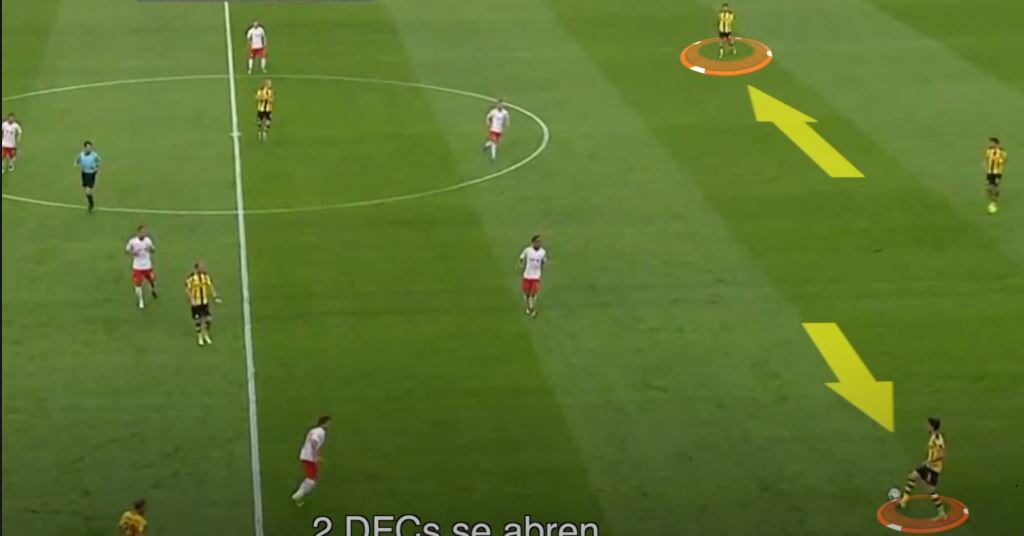 In termini più semplici, “La salida laviolpiana” significa costruire l’azione con tre giocatori nella fase di possesso, principalmente con due difensori centrali e un centrocampista difensivo che scende in mezzo ai due difensori centrale per formare una catena a tre con i terzini che, per conseguenza, tendono ad andare più larghi.