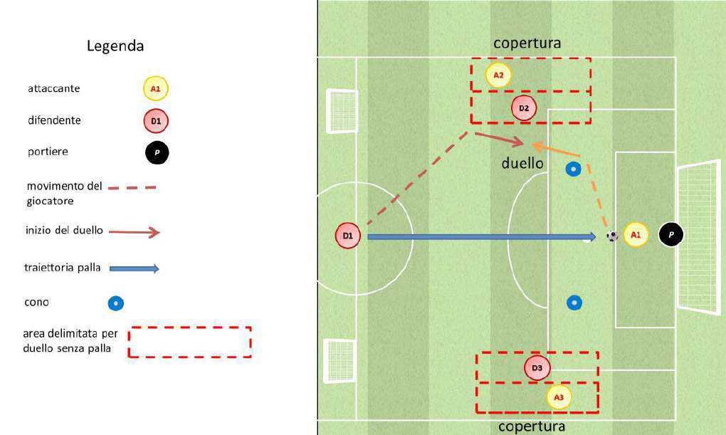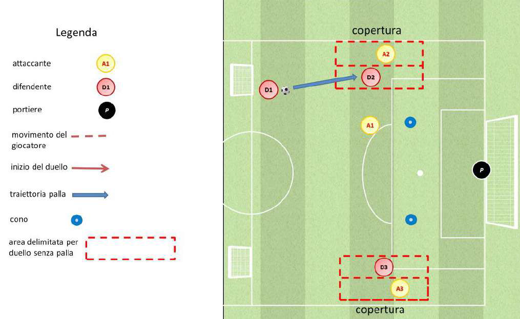 A1 e D1 eseguono un duello uno contro uno, nel quale l’attaccante A1 ha come obiettivo quello di segnare in una delle due porticine. Durante il duello tra A1 e D1, si sviluppano sulle corsie laterali, in due zone delimitate, due duelli senza palla tra A2 e D2, e tra A3 e D3. Gli attaccanti A2 e A3 avranno l’obiettivo di eseguire un movimento nella zona delimitata, per smarcarsi dalla loro marcatura diretta e per poter così ricevere un eventuale passaggio da A1. Gli attaccanti sulle corsie laterali, A2 e A3, potranno quindi smarcarsi per ricevere il pallone sui piedi, in una posizione più arretrata rispetto alla porticina verso cui attaccare, oppure cercando la profondità.